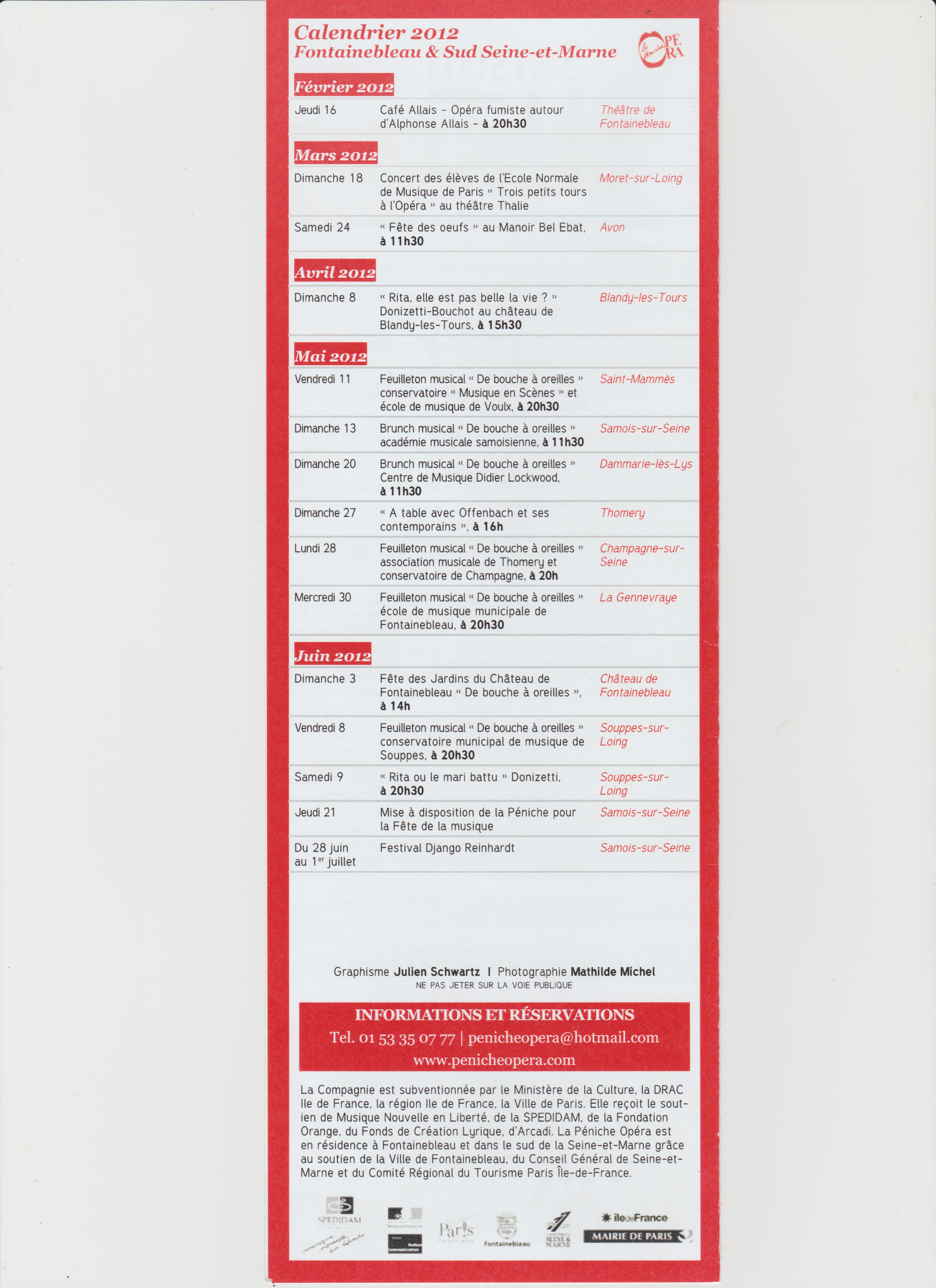 De 2009 à 2012 la Compagnie a été en résidence à Fontainebleau et dans le sud du département Seine et Marne, à la fois au théâtre municipal mais aussi dans certains lieux prestigieux de la ville et enfin au fil de l’eau … La Seine, le Loing, et l’Yonne. Durant cette période elle a créé trois spectacles par an au Théâtre (de l’opéra baroque à l’opéra du XXème siècle). Sur l’ensemble du département, les répétitions, rencontres, présentations, débats, concerts en appartement ou salons musicaux, ont accompagné les moments privilégiés que sont les créations de la compagnie, afin d’ouvrir l’opéra le plus largement possible à de nouveaux publics amateurs de spectacles vivants. Par ailleurs grâce à ces outils exceptionnels que sont les péniches, qui permettent de présenter des spectacles légers, des animations-initiations en navigation, la Péniche Opéra a su créer des passerelles entre le théâtre de Fontainebleau et les communes qui l’entourent. Elle a eu à cœur d’aller à la rencontre des publics et des populations. Avec des ateliers pédagogiques pour les scolaires, des actions de sensibilisation auprès des écoles de musique et des populations riveraines. 22 communes ont ainsi pendant quatre ans accueillis la compagnie et ses spectacles en péniche.